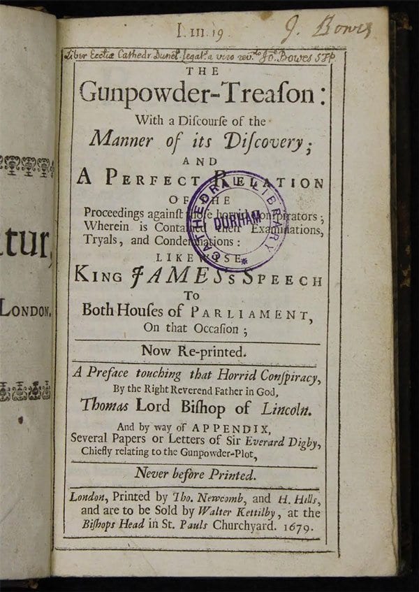 The Gunpowder Treason (1679), by Thomas Barlow, Lord Bishop of Lincoln, is one of 68 books in Durham Cathedral’s Adopt a Book catalogue. This features early printed books and manuscripts in need of urgent conservation work. People are invited to adopt a book to help pay for its conservation and that of others.