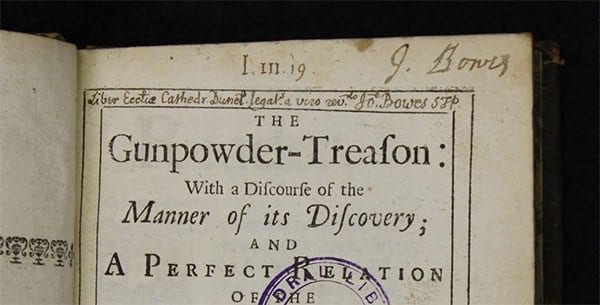 With perfect timing, a Mr Fawkes has supported Durham Cathedral’s Adopt a Book campaign by adopting a 17th century book about the Gunpowder Plot.