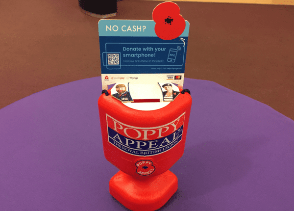 To enable the mobile donations, technology company Thyngs has partnered with WorldPay and Royal Bank of Scotland. Thirteen NatWest branches across the UK are trialling the poppy trays and collection tins, which enable people tap or scan the thyng with their smartphone to make a donation.