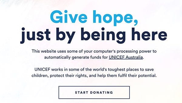 While the user is visiting the page their computer processor works on solving a series of cryptocurrency puzzles or equations, which underpin the operation of the cryptocurrency itself. In return for this work, the user is rewarded with minute elements of cryptocurrency, which is then automatically donated to Unicef Australia to turn into fiat or traditional currency.