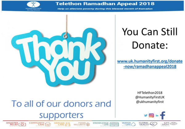 Thousands of people from 11 countries including the UK, USA, Pakistan, France, Belgium and Germany tuned into Humanity First’s Global Telethon, which started on 26 May and asked people to call in or donate online.
