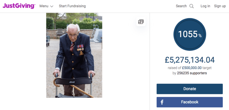 At one point in the campaign today the family of Stephen Sutton congratulated Captain Moore on passing Stephen’s fundraising total of £5,233,916 on JustGiving for Teenage Cancer Trust. Stephen had raised the record amount as he faced terminal cancer, and attracted international praise for his inspirational work.