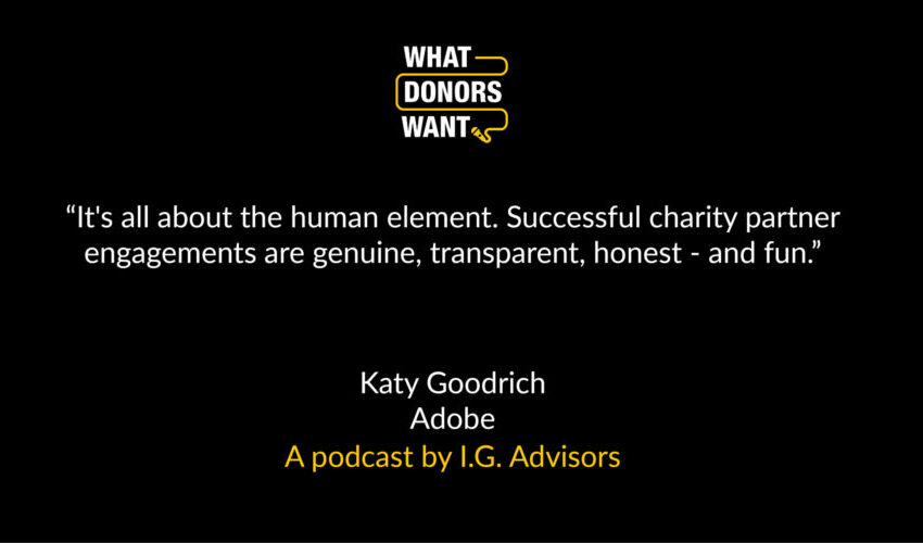 The interview was illuminating, with so many more examples and tips for building relationships with businesses to draw upon by listening to the full episode. You can hear the entire conversation between Katy Goodrich and I.G.’s Rachel Stephenson Sheff and Jasmine Awad by subscribing to What Donors Want on iTunes and Spotify.