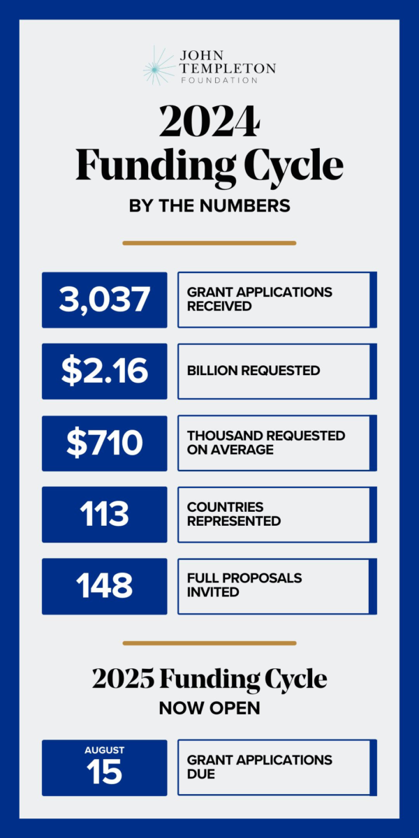 The John Templeton Foundation supports interdisciplinary research and “catalyses conversations that inspire awe and wonder”. Its funding areas define its philanthropic priorities and advance its aspiration to create a world where people are curious about the wonders of the universe, free to pursue lives of meaning and purpose, and motivated by great and selfless love.