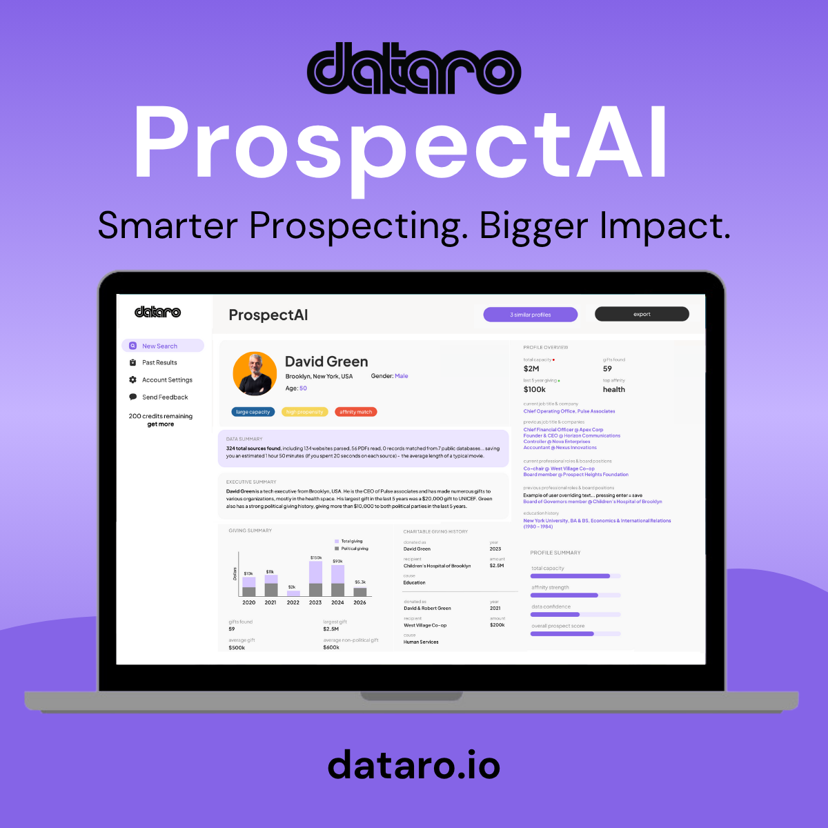 AI-powered fundraising platform Dataro has introduced ProspectAI, an AI Agent that is designed to support major donor fundraisers in researching and understanding potential major donors. In particular it should help them reduce the time they spend on prospect research.