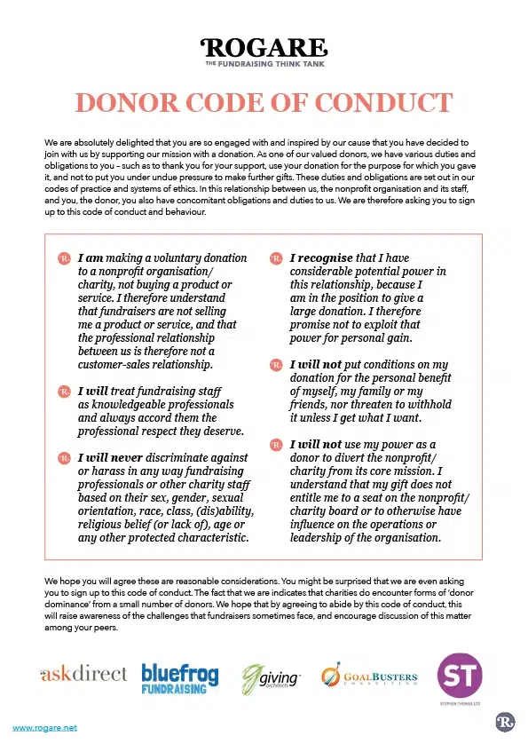 Rogare has published a sample Donor Code of Conduct which you can download.